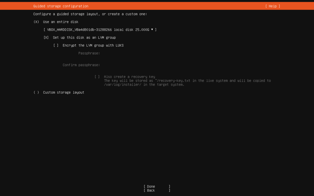 Şimdi sıra disk yapılandırmasına geldi. Bu adımda Use an entire disk seçerek devam edicem. Bu seçenek otomatik olarak diski lvm olarak ayarlayacaktır. Eğer diskleri kendiniz ayarlamak istiyorsanız Custom storage layout seçeneği ile devam edebilirsiniz.