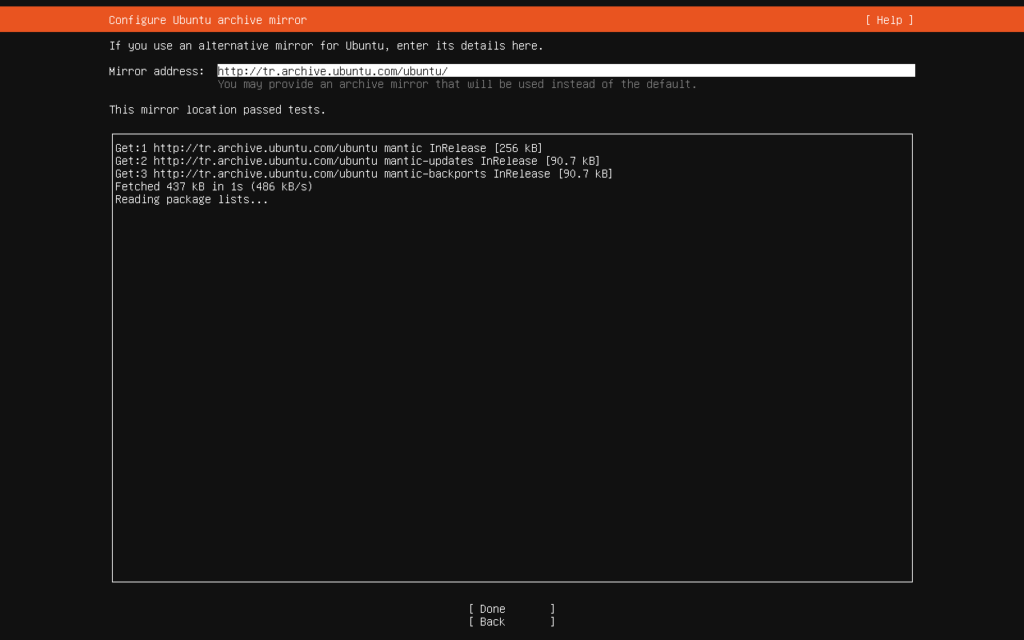 Bu kısımda mirror adres kendisi otomatik geliyor. Güncellemeleri bu adresten çekiyor. Bazen tr.archive.ubuntu.com adresinden çekemiyor. Altta yaptığı test fail olursa başındaki tr kısmını siliyorum. Şuan sıkıntı olmadığı için değişiklik yapmadan Done diyerek devam ediyorum.