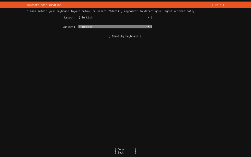 Sonraki ekranda klavye ayarlarımız geliyor. Klavyemizi otomatik belirlemesi istersek Itentify keyboard seçeneğini seçiyoruz. Burada bazı tuşlara basmamızı istiyor ve ona göre klavyemizi buluyor. Ben Layout kısmına gelip Turkish seçeneğini seçip devam ediyorum.